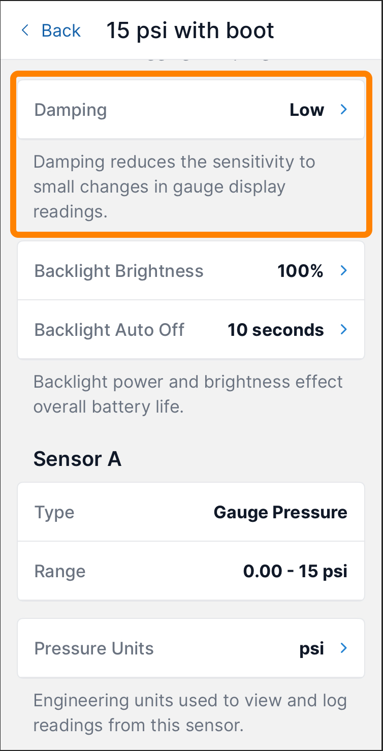 Damping slows the visual updates of a pressure gauge’s reading. The goal is to minimize minor fluctuations of the pressure reading on the screen caused by subtle variations in pressure that may create unwanted visual noise.