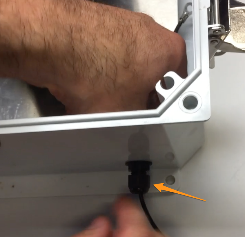 Thread the ground wire through bulkhead fitting in bottom right hole of the FieldLab Outdoor Enclosure.