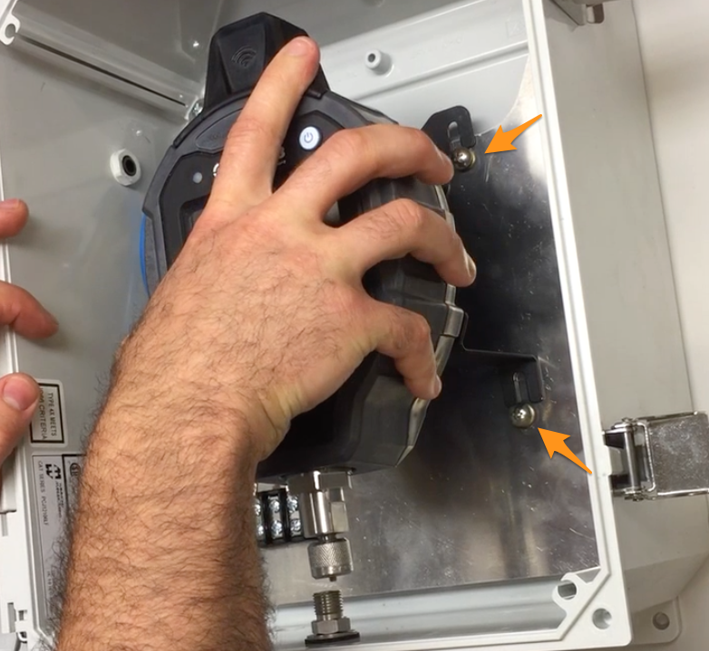 Slide the FieldLab and attached adapter bracket over back-side of the four screws on the back-inside wall of the enclosure. You may have to loosen the screws to make space for the bracket to slide behind them.