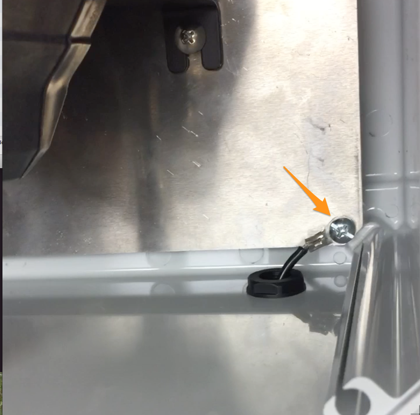 Connect the end of the ground wire to the back of the enclosure with the provided screw at the bottom right. Tighten screw with a Phillips head screwdriver.